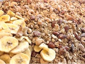 有機オートミールを中心にアーモンド、カシューナッツ、くるみ、バナナチップを贅沢に入れ